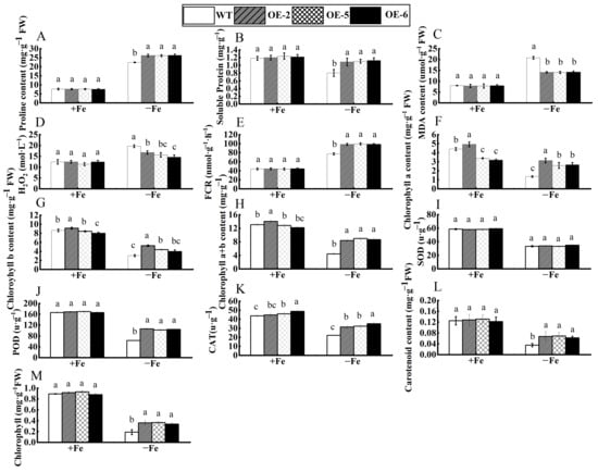 Physiological indices of WRKY69 transgenic and wild-type (WT) control tobacco grown for 30 days on Fe-sufficient or Fe-deficient media. (A). Pro content. (B). Soluble protein. (C). MDA content. (D). H2O2 content. (E). FCR activity. (F). Chlorophyll a content. (G). Chlorophyll b content. (H). Chlorophyll a + b content. (I). SOD activity. (J). POD activity. (K). CAT activity. (L) Carotenoid content. (M) Chlorophyll content. Note: different letters above the bars indicated significant differences (p < 0.05) as assessed by one-way ANOVA and the least significant difference (LSD) test.