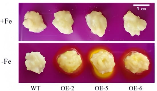 In this study, we produced WRKY69 transgenic tobacco plants and apple calli and examined their phenotypes alongside various physiological parameters under the conditions of iron deficiency stress. When subjected to iron deficiency stress, the transgenic tobacco exhibited enhanced growth vigor and elevated chlorophyll levels; specifically, the contents of chlorophyll a (Chla), chlorophyll b (Chlb), and total chlorophyll (Chla + b) were significantly increased compared to the wild type (WT). For example, the Chlb levels in transgenic tobacco lines OE-2, OE-5, and OE-6 increased by 71.76%, 43.53%, and 29.52%, respectively, relative to WT, indicating that these transgenic plants improved chlorophyll production and strengthened their resistance to iron deficiency stress []. Simultaneously, the analysis of apple calli acidification demonstrated that apple calli tissues with overexpression exhibited enhanced proton (H+) pumping. This observation indicates that the overexpression in apple calli tissues elevates the activity of plasma membrane (PM) H+-ATPase, resulting in a reduced pH that increases the solubility of iron []. These findings suggest that the WRKY69 gene act as positive regulators of plant response to Fe deficiency stress.