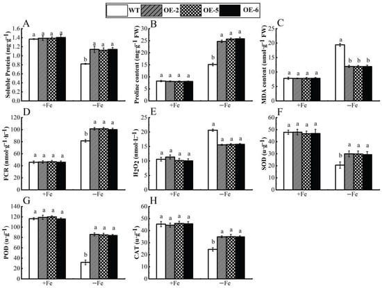 Physiological indices WRKY69 transgenic and wild-type apple calli grown for 20 days on Fe-sufficient or Fe-deficient media. (A). Soluble protein. (B). Pro content. (C). MDA content. (D). FCR activity. (E). H2O2 content. (F). SOD activity. (G). POD activity. (H). CAT activity. Note: different letters above the bars indicated significant differences (p < 0.05) as assessed by one-way ANOVA and the least significant difference (LSD) test.