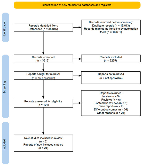 The initial electronic search yielded 35,076 records. After duplicates and ineligible records were removed, 3312 records remained for title and abstract screening. Of these, 3225 were excluded, and 101 were advanced for detailed assessment. Among the 101 articles assessed for eligibility, 79 were excluded for various reasons. A supplementary hand search added two additional articles. Thus, 24 studies satisfied the eligibility criteria and were included in this review (Figure 1).