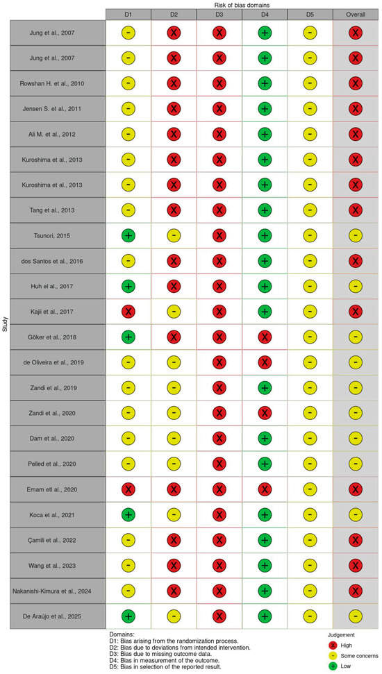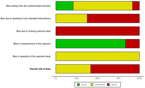 - McGuinness, L.A.; Higgins, J.P.T. Risk-of-bias VISualization (robvis): An R package and Shiny web app for visualizing risk-of-bias assessments. Res. Synth. Methods 2020, 12, 55–61. [Google Scholar] [CrossRef]