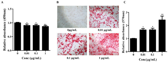 Effects of Osteolforte on cell viability and osteogenic differentiation of BMSCs. (A) Cell viability assessed by CCK-8 assay after treatment with Osteolforte at various concentrations (5–100 μg/mL) for 48 h. No significant cytotoxicity was observed across tested concentrations. (B) Representative images of Alizarin Red S staining showing calcium deposition in BMSCs treated with Osteolforte at 0, 0.01, 0.1, and 1 μg/mL for 14 days. 100×. The intensity of red staining indicates the extent of osteogenic differentiation. (C) Quantification of Alizarin Red S staining by measuring absorbance at 570 nm. Osteolforte significantly enhanced mineralization in a dose-dependent manner. Data are presented as mean ± SEM (n = 3). * p < 0.05, ** p < 0.01 vs. control (0 μg/mL).