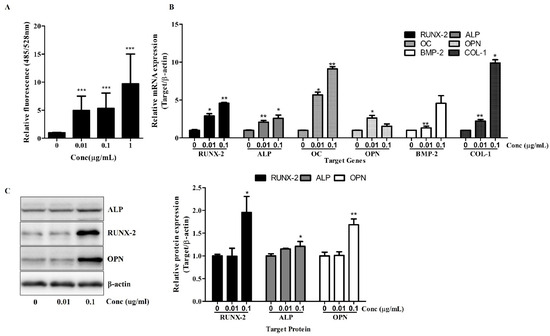 First, ALP activity, an early marker of osteogenic differentiation, was measured on day 7 using a fluorometric assay. As shown in Figure 2A, Osteolforte treatment significantly increased ALP activity in a dose-dependent manner. Even at the lowest concentration (0.01 µg/mL), ALP activity was markedly elevated compared to the control (*** p < 0.001), with the highest activity observed at 1 µg/mL, suggesting enhanced early osteogenic commitment.