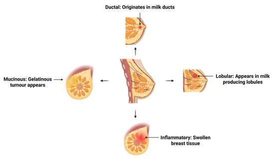 Breast cancer can arise from various tissues within the breast, leading to multiple histological subtypes. These include, but are not limited to, ductal, lobular, mixed tumors, mucinous, and inflammatory breast cancer (Figure 1) [5,6]. Ductal breast cancer has the highest prevalence, accounting for between 50 and 80% of all breast cancer cases [6]. It is formed in the ductal region of the breast, which transports milk from the lobules to the nipples [7]. Similarly, lobular breast cancer forms in the milk producing lobules attached to the ducts [7]. This subtype accounts for approximately 5–15% of cases [6,8]. Mixed tumors are characteristic of cancer growing in both the ducts and lobules and accounts for approximately 25.3% of all breast cancer cases [6]. Mucinous breast cancer demonstrates a greater presence of extracellular mucin and affects around 2% of those diagnosed with breast cancer [6,9]. Lastly, inflammatory breast cancer presents as inflammation, redness, or changes to the skin of the breast and is a more rare and aggressive type of breast cancer, with an incidence rate of roughly 2–4% [5].