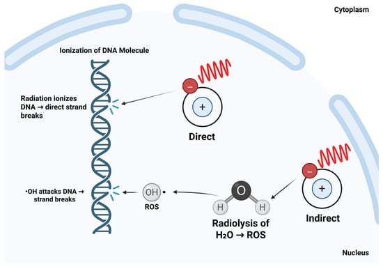 Mechanisms of radiation-induced DNA damage: direct and indirect effects. Ionizing radiation damages DNA through two primary mechanisms. In direct damage, radiation interacts directly with DNA molecules, causing strand breaks and base modifications. In indirect damage, radiation interacts with cellular water to generate reactive oxygen species (ROS), which then chemically damage DNA. Both pathways contribute to the cytotoxic effects of radiation therapy. Created in BioRender. Derbowka, R. (2025) https://BioRender.com/49mv0nd.