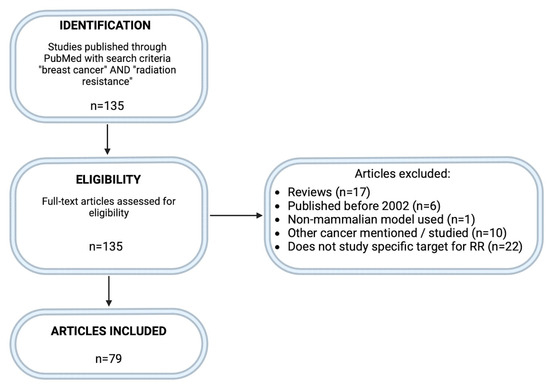 This systematic review was conducted in accordance with the PRISMA (Preferred Reporting Items for Systematic Reviews and Meta-Analyses) guidelines. A comprehensive literature search was performed using the PubMed database to identify relevant studies published between 2002 and 2024. The advanced search function was used, with the keywords “breast cancer” AND “radiation resistance” applied to both the title and abstract fields. To refine the results, review articles were excluded by applying the filter “Review [Publication Type]” in combination with the search term NOT. Additional exclusion criteria included studies published before 2002, those using non-mammalian models, articles focusing on non-breast cancers, and studies that did not investigate a specific molecular target related to radiation resistance. A total of 135 articles were identified initially. After applying the inclusion and exclusion criteria, 79 full-text articles were retained for analysis. The study selection process is summarized in Figure 3.