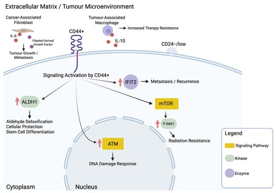 Key molecular pathways activated in CD44+/CD24−/low breast cancer stem cells contributing to radiation resistance. Schematic representation of molecular targets and signaling pathways associated with radiation resistance in breast cancer stem cells exhibiting the CD44+/CD24−/low phenotype. CD44-mediated signaling has been linked to the upregulation of ALDH1, IFIT2, ATM, and the mTOR pathway, including its downstream effector phosphorylated S6 kinase 1 (p-S6K1). These factors contribute to enhanced DNA repair capacity, survival, and resistance to radiotherapy. The tumor microenvironment further enhances these characteristics in breast cancer through the secretion of interleukin-6 (IL-6) and platelet-derived growth factors from cancer-associated fibroblasts. Tumor-associated macrophages further contribute to therapy resistance through the secretion of interleukin-10 (IL-10). Created in BioRender. Mageau, E. (2025) https://BioRender.com/c6b46ka.