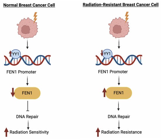 Exposure to ionizing radiation induces DNA damage, making DNA repair pathways a central consideration in understanding mechanisms of radiation resistance. Relevant studies investigating DNA damage response and repair pathways in breast cancer models are summarized in Table 2. In one such study, Wang et al. [48] examined the role of flap endonuclease 1 (FEN1) in MDA-MB-231 cells. FEN1 is a key enzyme in DNA replication and repair and is often upregulated in response to chemotherapeutic agents and ionizing radiation, enabling cancer cells to survive and proliferate despite genotoxic stress. The authors also investigated the role of YY1, a transcriptional repressor known to bind the FEN1 promoter. Under normal conditions, YY1 suppresses FEN1 expression; however, radiation or chemotherapy exposure was found to reduce YY1 levels, leading to increased FEN1 expression and enhanced cellular repair capacity [48]. Restoration of YY1 expression repressed FEN1 and increased radiosensitivity, suggesting that the YY1–FEN1 axis may represent a viable therapeutic target to overcome radiation resistance in breast cancer (Figure 5) [48].