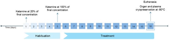 A timeline of the procedure from the first ketamine administration to the organ collection and cryopreservation. Ketamine’s concentration gradually increased during the habituation period from 20% (day 1) of its final concentration to 100% (day 5). During the treatment period (days 5–16), the administered ketamine concentration (K5: 5 mg/mL; K10: 10 mg/mL) was not altered.
