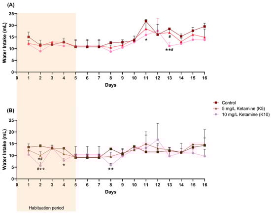 The female (A) and male (B) daily water intake (mL) per cage (control: 2 cages; K5: 4 cages; K10: 4 cages), including the initial habituation period of 5 days during which ketamine concentration was gradually increased. Statistical analysis was performed using ANOVA followed by Šidák’s multiple comparison test for each day, and the results are presented as mean and SD. * indicates significant differences from the control group (* p < 0.05, ** p < 0.01), and # indicates significant differences between the K5 and K10 groups (# p < 0.05).