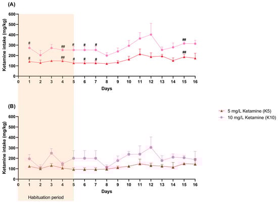 The female (A) and male (B) daily ketamine intake (mg/kg) per cage (control: 2 cages; K5: 4 cages; K10: 4 cages) calculated based on daily water consumption (mL) and the average weight (kg) of the mice. The habituation period is visually represented in the figure (days 1–5). Statistical analysis was performed using ANOVA followed by Šidák’s multiple comparison test for each day, and the results are presented as mean and SD. # indicates significant differences between the K5 and K10 groups (# p < 0.05, ## p < 0.01).