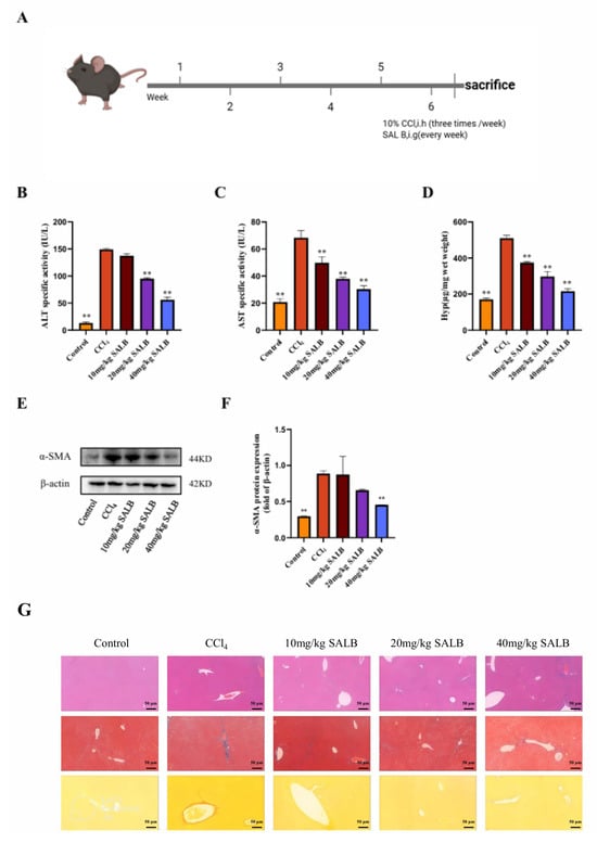 In this study, male C57BL/6 mice, sourced from Slack Jingda Experimental Animal Company in Changsha, China, were utilized. At the time of experimentation, the mice were aged between 6 and 8 weeks and weighed approximately 20 to 22 g. The mice were maintained under controlled environmental conditions, which included a 12 h light/dark cycle and a temperature of 22 ± 2 °C. They were provided with ad libitum access to food and water. All experimental protocols were approved by the Institutional Ethical Committee on Animal Care and Experimentations at Hunan University of Chinese Medicine, Changsha (Approval Number: HNUCMZI-2407-15, Date: 15 July 2024), adhering to the guidelines outlined in the “Guide for the Care and Use of Laboratory Animals” published by the US National Institutes of Health, National Research Council (2011, 8th ed., National Academies Press, ISBN 978-0-309-15400-0). Following a one-week acclimatization period, the mice were randomly assigned to six groups, each consisting of 10 mice: the control group, the CCl4 group, and three treatment groups receiving low (10 mg/kg, i.g.), medium (20 mg/kg, i.g.), and high (40 mg/kg, i.g.) doses of SAL B. The mice were administered their respective treatments or an equivalent volume of saline intragastrically each day between 9:00 and 10:00 a.m. for a duration of 42 days. Except for the control group, all groups received subcutaneous injections of 10% CCl4 (dissolved in corn oil) at a dosage of 0.1 mL/10 g body weight, three times per week for 6 weeks. The control group received isopycnic corn oil injections. Following a 1-week acclimatization period, the mice were randomly assigned to six groups, each consisting of 10 mice: the control group; the CCl4 group; and three treatment groups receiving low (10 mg/kg, i.g.), medium (20 mg/kg, i.g.), and high (40 mg/kg, i.g.) doses of SAL B. The mice were administered their respective treatments or an equivalent volume of saline intragastrically each day between 9:00 and 10:00 a.m. for a duration of 42 days. Except for the control group, all groups received subcutaneous injections of 10% CCl4 (dissolved in corn oil) at a dosage of 0.1 mL/10 g body weight, three times per week for 6 weeks. The control group received isopycnic corn oil injections.