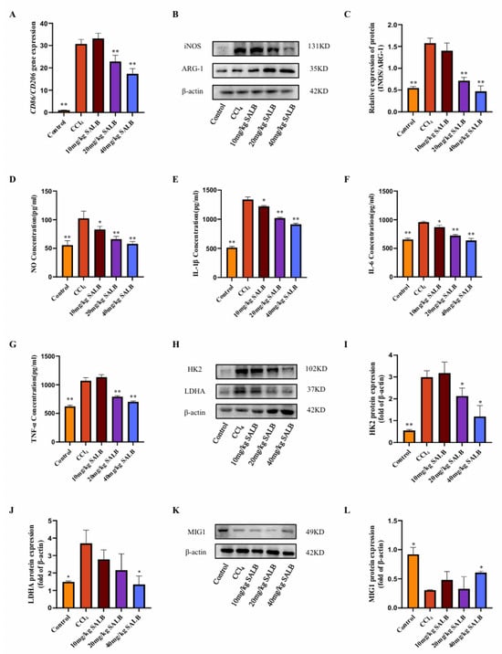 Transcriptional regulation of glycolysis is fundamentally governed by the MYC oncogene, which directly activates key glycolytic enzymes, including HK2 and LDHA [,]. Beyond MYC, recent research has identified MIG1 as a critical coordinator of nuclear-mitochondrial communication, regulating glycolysis specifically in colorectal cancer []. In Saccharomyces cerevisiae, the zinc finger protein MIG1 functions as a well-established glucose metabolic regulator, primarily mediating glucose repression []. Our Western blot analysis revealed that MIG1 protein expression levels were diminished in the liver of the model group, but were significantly restored following SAL B treatment (Figure 2K,L). In conclusion, our experimental findings suggest that SAL B treatment modulates the polarization and glycolytic activity of liver macrophages in mice treated with CCl4, thereby inhibiting the production of inflammatory factors.