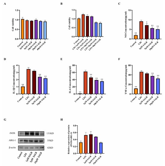 SAL B reduced the inflammatory responses and polarization of macrophages stimulated by LPS. (A) Cell viability measured by CCK8 assay after SAL B treatment with RAW 264.7 at various concentrations (0, 1, 5, 10, 20, 40 µM). (B) Cell viability measured by CCK8 assay after LPS and SAL B treatment with RAW 264.7 at various concentrations (0, 1, 5, 10, 20, 40 µM). (C) NO secretions were determined by Griess assay, respectively, in cell culture medium with RAW 264.7 LPS or non-treated (NT) and SAL B therapy. (D–F) IL-1β, IL-6, and TNF-α secretions were determined by ELISA, respectively, in cell culture medium with RAW 264.7 LPS or NT and SAL B therapy. (G,H) Western blot analysis to detect the expression of INOS and ARG-1 in RAW 264.7 LPS or NT and SAL B therapy. Data are presented as means ± SEM. (n = 3). * p < 0.05, ** p < 0.01. Data are representative of three independent experiments with similar results.