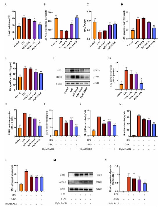 Initially, we measured lactate concentration, the terminal metabolite of aerobic glycolysis (Figure 4A). LPS stimulation markedly elevated lactate levels, whereas SAL B treatment induced a dose-dependent reduction in lactate accumulation. This finding directly indicates that SAL B effectively attenuates glycolytic flux. Complementing these metabolic observations, we assessed alterations in cellular energy status. LPS treatment significantly decreased both ATP levels and the NAD+/NADH ratio (Figure 4B,C). Notably, SAL B administration counteracted these perturbations, dose-dependently elevating ATP concentrations and restoring the NAD+/NADH ratio. These data collectively demonstrate that SAL B rescues the LPS-impaired cellular energy production capacity.