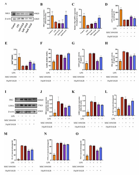 SAL B reduced glycolysis by upregulating MIG1. (A,B) Western blot analysis to detect the expression of MIG1 in the cell lysate after treatment with LPS or NT and SAL B therapy for 24 h. (C) qRT-PCR analysis of Mig1 mRNA in the cell lysate after treatment with LPS or NT and SAL B therapy for 24 h. (D,E) ATP and NAD+/NADH secretions were determined by Colorimetric method and WST-8 assay, respectively, in the cell lysate after treatment with LPS or NT, MSC1094308, and SAL B therapy for 24 h. (F) Lactate secretions were determined by Colorimetric method assay, respectively, in the cell supernatant after treatment with LPS or NT, MSC1094308, and SAL B therapy for 24 h. (G,H) The enzyme activity levels of HK and LDHA were measured in the cell lysate after treatment with LPS or NT and SAL B therapy for 24 h. (I–K) Western blot analysis to detect the expression of HK and LDHA in the cell lysate after treatment with LPS or NT, MSC1094308, and SAL B therapy for 24 h. (L–N) IL-1β, IL-6, and TNF-α secretions were determined by ELISA, respectively, in the cell supernatant after treatment with LPS or NT, MSC1094308, and SAL B therapy for 24 h. (O) NO secretions were determined by Griess assay, respectively, in the cell supernatant after treatment with LPS or NT, MSC1094308, and SAL B therapy for 24 h. Data are presented as means ± SEM. (n = 3). * p < 0.05, ** p < 0.01. Data are representative of three independent experiments with similar results.