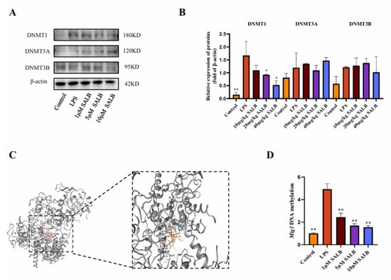 The MIG gene family has a close regulatory relationship with DNA epigenetic modification inheritance (especially DNA methylation), which makes MIG play a key role in metabolism-related diseases. To investigate whether SAL B promotes the expression of MIG1 through DNA methylation, we assessed the expression of DNA methyltransferases by protein blotting analysis (Figure 6A,B). Among the three major DNA methyltransferases in mammals—DNMT1, DNMT3A, and DNMT3B [], we found that under LPS stimulation, the protein expression of DNMT1, DNMT3A, and DNMT3B increased to varying degrees. Under the influence of SAL B, the protein expression of DNMT1 was significantly reduced, while there was no significant effect on the protein expression of DNMT3A and DNMT3B. Through molecular docking experiments, SAL B interacts with multiple amino acid residues of the protein DNMT1 via hydrogen bonds (Figure 6C). Docking score: −9.8. To further investigate the effect of SAL B on MIG1 methylation expression, we used sodium bisulfite conversion detection to assess MIG1 DNA methylation levels. The results demonstrated that SAL B treatment led to a reduction in MIG1 DNA methylation levels (Figure 6D). Together, these results indicate that SAL B reduces the DNA methylation level of MIG1 by inhibiting the expression of the methyltransferase DNMT1, thereby enhancing the expression level of MIG1.