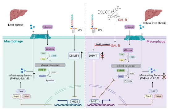Schematic diagram. The present study demonstrated that SAL B significantly ameliorated liver fibrosis-associated inflammation and reduced the expression of inflammatory factors. This protective effect was achieved through inhibition of macrophage M1 polarization and glycolysis. SAL B upregulated the transcription factor MIG1, which inhibited the expression of key glycolytic proteins, thereby reducing macrophage M1 polarization and the release of inflammatory factors.