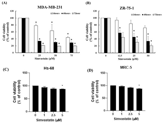 Simvastatin inhibited cell survival/proliferation of TNBC cells. (A) Simvastatin mediates the survival of MDA-MB-231 and (B) ZR-75-1 cells (n = 3 per group) and thus inhibits their proliferation. In vitro study was initiated by treating each cell line with increasing doses of Simvastatin for 24 h. The survival of these Simvastatin-treated MDA-MB-231 and ZR-75-1 cells was then measured by MTT method. (C,D) showing MTT assay results for normal human fibroblast cell lines HS68 (skin) and MRC5 (lung) treated with varying concentrations of Simvastatin. Results were expressed as a percentage of control, which was considered as 100%. All data were reported as the means (±SEM) of at least three separate experiments. Statistical analysis used the t-test, with the significant differences determined at the level of * p < 0.05 versus control (0 uM) or time 0 group.