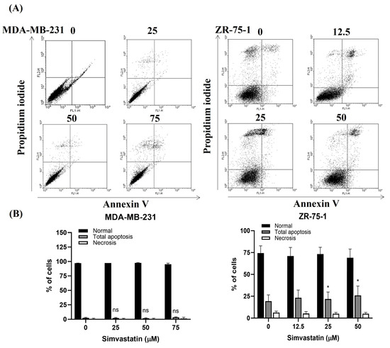 Influence of Simvastatin on TNBCs. (A) Total apoptosis and necrosis in MDA-MB-231 and ZR-75-1 cells after 4 h of incubation with Simvastatin. Simvastatin did not significantly increase the apoptosis rate of MDA-MB-231 cells, but on the contrary, it increased the apoptosis rate of ZR-75-1 cells. (B) Results were expressed as a percentage of control, which was considered as 100%. All data were reported as the means (±SEM) of at least three separate experiments. Statistical analysis used the t-test, with the significant differences determined at the level of * p < 0.05 versus control (0 uM) or time 0 group.