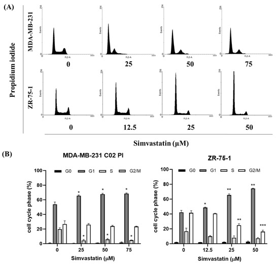 As shown in Figure 3A,B, Simvastatin induced an increase in G1 phase and a decreased in S phase cellsSimvastatin treatment resulted in a noticeable shift in cell cycle distribution, characterized by a marked increase in the proportion of cells in the G1 phase. Concurrently, a reduction was observed in the number of cells residing in both the S and G2/M phases. Figure 3A shows MDA-MB-231 and ZR-75-1 cells after treatment with Simvastatin for 24 h. Figure 3B demonstrates that Simvastatin treatment led to an increase in the proportion of cells in the G1 phase and a decrease in the S phase. Concurrently, a reduction was observed in the number of cells residing in both the S and G2/M phases. This redistribution pattern suggests that Simvastatin induces a G1 phase arrest in TNBC cells, thereby impeding progression through the cell cycle. Furthermore, this effect was found to be dose-dependent, with higher concentrations of Simvastatin producing a more pronounced accumulation of cells in the G1 phase. Statistical analysis confirmed the significance of this observation, as the percentage of G1-arrested cells was significantly elevated in treated groups compared to the untreated control (* p < 0.05, ** p < 0.01, ***p < 0.001 vs. Simvastatin 0 μM). These findings strongly support the hypothesis that Simvastatin exerts its antiproliferative effects, at least in part, by halting cell cycle progression at the G1 checkpoint.