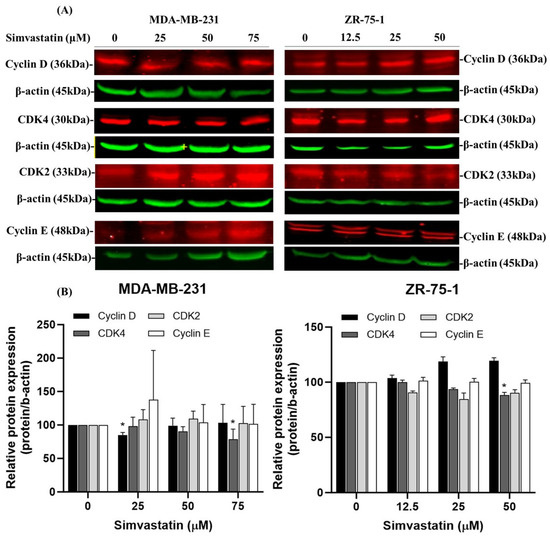 Cyclin-dependent kinase 4 (CDK4) plays a crucial role in regulating the G1 to S phase transition of the cell cycle by forming an active complex with cyclin D, which phosphorylates the retinoblastoma protein (Rb) [28], thereby promoting E2F-mediated transcription and DNA synthesis [27]. Dysregulation of this pathway, particularly through CDK4 overexpression, contributes to unchecked cellular proliferation and is frequently associated with poor prognosis in various cancers, including breast carcinoma [29]. Our data indicate that CDK4 downregulation is a consistent and prominent effect of Simvastatin treatment, particularly at higher concentrations (75 μM), in both TNBC (MDA-MB-231) and non-TNBC (ZR-75-1) cell lines. This effect was not paralleled by equally significant changes in other G1/S regulatory proteins, such as Cyclin E or CDK2.Furthermore, while Cyclin D1 showed a reduction in expression at lower concentrations (25 μM) in MDA-MB-231 cells, this effect was less consistent and more dose-sensitive compared to CDK4. Therefore, we clarified in the revised manuscript that Simvastatin appears to exert a relatively more selective and robust inhibitory effect on CDK4, rather than broadly suppressing all components of the G1/S checkpoint (Figure 4). This effect coincided with a reduction in CDK4 protein expression, indicating that Simvastatin-induced G1 arrest may occur via non-apoptotic mechanisms involving suppression of CDK4. Notably, high CDK4 expression has been strongly correlated with worse outcomes in TNBC, supporting its identification as a potential oncogene and therapeutic target. The ability of Simvastatin to downregulate CDK4 highlights a novel mechanism by which it may exert anticancer activity in TNBC cells. This observation is consistent with previous studies reporting that CDK4 inhibition suppresses tumor growth and enhances therapeutic sensitivity [23,30]. This effect coincided with a reduction in CDK4 protein expression, suggesting that Simvastatin-induced G1 arrest may involve suppression of CDK4. However, this association remains correlative, and further mechanistic studies—such as CDK4 overexpression or knockdown experiments—are warranted to determine whether CDK4 downregulation plays a causative role in Simvastatin-mediated cell cycle arrest. Collectively, our findings support the potential of Simvastatin as a candidate for targeting CDK4 to induce G1 arrest and ultimately promote apoptosis in breast cancer cells. Our results indicate that simvastatin induces G1 cell cycle arrest in TNBCs through the downregulation of CDK4, suggesting that Simvastatin’s anti-cancer effects are associated with its ability to suppress the cell cycle. This finding underscores the anti-carcinogenic and protective role of Simvastatin in ZR-75-1 cells. However, as illustrated in Figure 1 and Figure 3, Simvastatin appears to affect the survival of both MDA-MB-231 and ZR-75-1 cells through mechanisms other than apoptosis. Therefore, the inhibition of cell proliferation by Simvastatin in these cell lines is likely mediated by pathways distinct from those involving apoptosis.