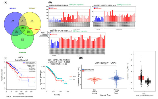 CDK4 is highly expressed in BRCA tissues and is closely related to poor prognosis. (A) Venn diagram for both three datasets of comparisons, indicating CDK4 was one of the most significantly involved in BRCA tissues and normal breast specimens. (B) Gene expression analysis with GSE38959, GSE45827, and GSE65194 datasets in CDK4 expression in BRCA tissues and normal tissues. (C) Kaplan-Meier analysis for CDK4 expression using BRCA patient samples. (D) CDK4 gene expression analysis using TCGA BRCA database. High expression of CDK4 in BRCA tissues, compared with normal tissue. **** p < 0.0001 versus solid tissue normal with primary solid tumor.