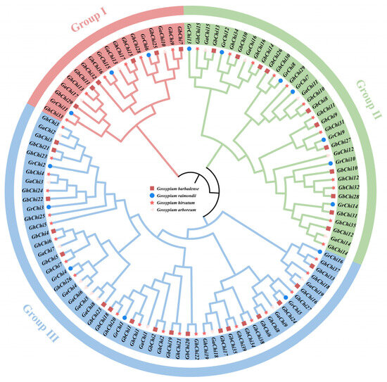 Chi family members were systematically annotated in each species: GbChi1–GbChi35 in Gossypium barbadense, GhChi1–GhChi37 in G. hirsutum, GaChi1–GaChi19 in G. arboreum, and GrChi1–GrChi16 in G. raimondii. Phylogenetic analysis of all 107 Chi proteins revealed three primary clades across the four cotton species (Figure 2). This finding indicates that clade composition is largely conserved among these species, despite differences in the number of Chi genes within each lineage. This phylogenetic topology suggests a conserved pattern of functional diversification during the evolution of Gossypium. In particular, clade-specific expansions or contractions of the Chi gene family likely reflect lineage-specific adaptations.