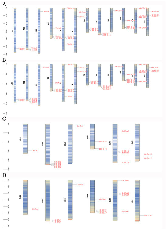Chromosome mapping of Chi family members in four cotton species. Notes: (A) Locations of Chi genes on chromosomes in island cotton; (B) locations of Chi genes on chromosomes in upland cotton; (C) locations of Chi genes on chromosomes in Asian cotton; (D) locations of Chi genes on chromosomes in Raymond cotton. GhA01–GhD11 represent chromosomes 1 to 11 in island cotton, and Chr01–Chr11 represent chromosomes 1 to 11 in Asian and Raymond cotton.