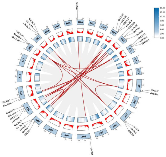 In the G. barbadense genome (which contains 35 GbChi genes), intragenomic synteny analysis identified 25 collinear (duplicated) gene pairs (Figure 5). These duplicated pairs showed distinct distribution patterns between the two subgenomes. For example, two duplicated pairs (GbChi10/GbChi12 and GbChi7/GbChi15) were located on the A subgenome (chromosomes A09 and A10), whereas four pairs (GbChi17/GbChi18, GbChi19/GbChi21, GbChi35, and GbChi28/GbChi31) were located on the D subgenome (chromosomes D01, D02, and D09–D11).