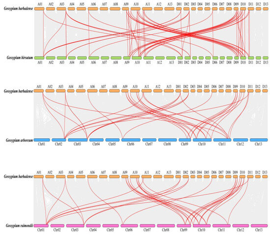 Moreover, cross-species collinearity analysis demonstrated pronounced conservation between G. barbadense and G. hirsutum, with these two tetraploid species sharing 68 syntenic gene pairs (Figure 6). In contrast, moderate conservation was observed between G. barbadense and its diploid progenitors. Specifically, G. barbadense shared 34 syntenic pairs with G. arboreum (A-genome ancestor) and 32 with G. raimondii (D-genome ancestor). Notably, several chromosomal hotspots in G. barbadense exhibited one-to-many syntenic relationships. For instance, four GbChi loci (GbChi3, GbChi10, GbChi21, and GbChi30), all located on chromosomes Chr09–11, exhibited pleiotropic collinearity across multiple chromosomes in other cotton genomes. Interestingly, a unique syntenic link was identified between GbChi20 (in G. barbadense) and GaChi3 (in G. arboreum), suggesting the lineage-specific retention of this gene pair.