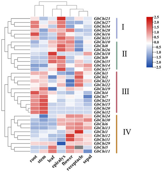 Fragments per kilobase of transcription per million mapped reads (FPKM) values for G. barbadense Chi genes across diverse tissues were retrieved from the Cotton Functional Genomics Database (CottonFGD, https://cottonfgd.org/, accessed on 26 December 2024). The resulting expression matrix was normalized and hierarchically clustered using the HeatMap module of TBtools (v1.108), revealing spatiotemporal expression patterns and tissue-specific regulatory differences associated with plant development and growth.