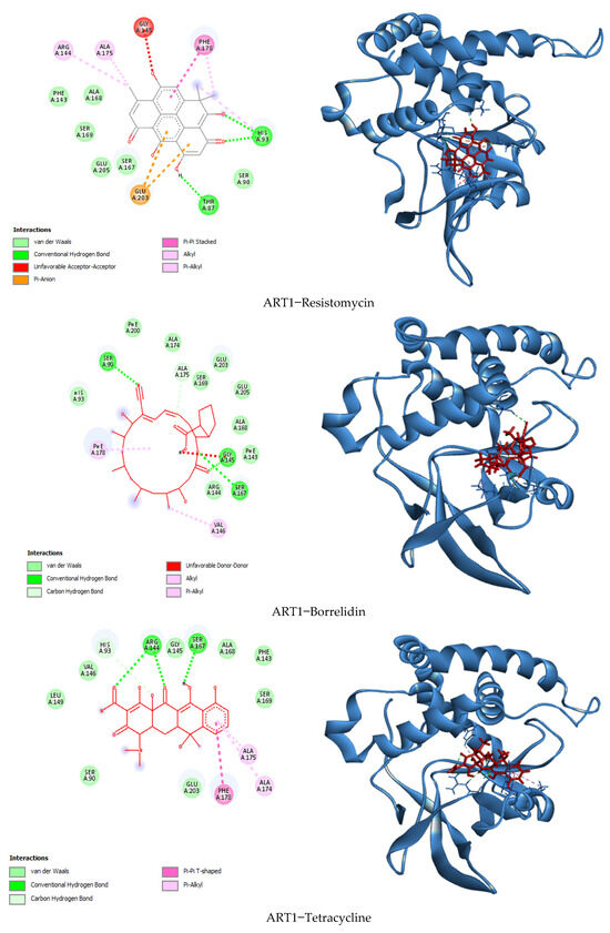In this study, a molecular docking analysis was performed on 100 secondary metabolites derived from various actinomycete species to evaluate their potential inhibitory activity against the ART1 enzyme. The docking simulations were conducted using UCSF Chimera as the interface, with AutoDock Vina serving as the docking engine. To validate the docking protocol, meta-iodo-benzyl-guanidine—a well-characterized ART1 inhibitor—was used as a reference compound, yielding a binding energy of −6.1 kcal/mol. Following successful validation, the actinomycetal compounds were docked against the ART1 model. Among the tested molecules, four compounds demonstrated the most favorable binding affinities, with binding energies ranging from −8.9 kcal/mol to −9.3 kcal/mol. Resistomycin exhibited the strongest interaction with ART1, displaying a binding energy of −9.3 kcal/mol. This was followed by borrelidin and tetracycline, both with binding energies of −9.0 kcal/mol, and oxytetracycline with −8.9 kcal/mol (Table 1). These values suggest stronger and potentially more stable interactions with the ART1 active site compared to the reference molecule, highlighting these compounds as promising candidates for further investigation.