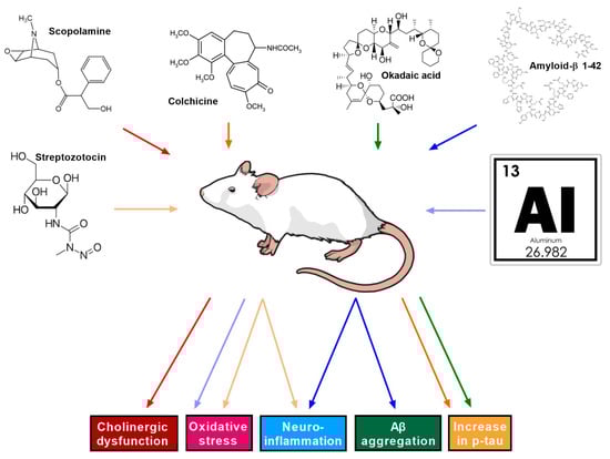 Chemically induced animal models of Alzheimer’s disease. AD induced by administration of streptozocin, scopolamine, colchicine, okadaic acid, amyloid β, and aluminum leading to cholinergic dysfunction, oxidative stress, neuroinflammation, Aβ accumulation, and p-tau increase.