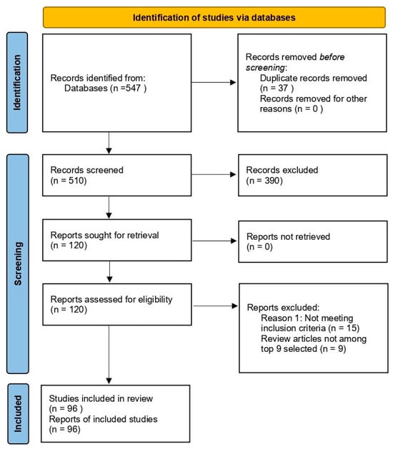 The search items included dementia; Alzheimer’s disease; SCO-induced model of AD; natural substances classified by type as polyphenols, alkaloids, terpenoids, or flavonoids; and in vivo studies of phytochemicals in the treatment of SCO-induced AD. A total of 547 articles were identified in the initial phase. Finally, after content analysis, only 96 matching articles were selected. PRISMA guidelines were used for reporting articles (Figure 2).