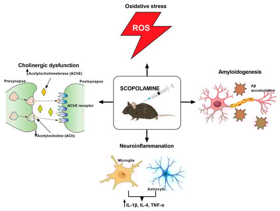 Most in vivo studies have shown that SCO can cause the atrophy of brain neurons, as well as induce the accumulation of Aβ in the brain by increasing the activity of tau kinase, which is involved in the pathogenesis of AD [,,]. This compound is also able to disrupt the functioning of cholinergic circuits by reducing the level of ACh and increasing the activity of AChE, which impairs cognitive functions in the rodents, similarly to the neurodegenerative symptoms in human AD [,,,,,,,]. Other preclinical studies on mice [,] and rats [,] indicated memory impairment associated with oxidative stress and impaired antioxidant defense mechanisms caused by the accumulation of malondialdehyde (MDA), a characteristic feature of AD. Moreover, SCO has also been shown to have a proapoptotic effect on hippocampal neurons, leading to abnormal apoptosis, which is also related to neurodegenerative diseases (NDs) [,]. SCO also shows a pro-inflammatory effect, similar to inflammation in AD, as evidenced by the increase in the levels of IL-1β, IL-4, and TNF-α in the brain after its administration (Figure 3) []. Finally, SCO adversely affects brain functions by reducing the level of BDNF [,], a factor that plays a key role in neuroprotection and neurogenesis []. The model’s limitations are highlighted by Klinkenberg and Blokland [] and include the possibility of negative outcomes, including changes in pupil width, smooth muscle dysfunction, and salivary secretion. Moreover, SCO does not contribute to the disorder’s progression and has a transient effect. This model continues to be one of the most widely utilized in preclinical research in spite of these drawbacks.
