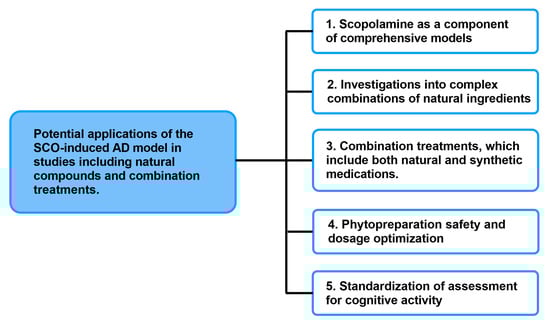 Given the present applications of SCO-induced AD in scientific studies, it can certainly be effectively utilized in investigations involving natural substances and combination therapies (Figure 4). The incorporation of the SCO model into integrated experimental methods, which include both transgenic and toxic models, ought to be one of the primary avenues for future research. In light of the more intricate and protracted pathological alterations seen in AD, this kind of method will provide functional verification of the compounds’ actions. Thus, in preclinical research, the SCO model can serve as a screening tool to help identify the most promising treatment options.