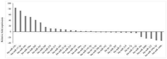 Figure 1. Fold regulation of differentially expressed miRNAs in Holstein cows with metritis of 84 bovine-specific well-characterized miRNAs investigated, 16 were upregulated (p ≤ 0.05; fold ≥ 2) and 14 were downregulated (p ≤ 0.05; fold ≤ −2) in circulation.