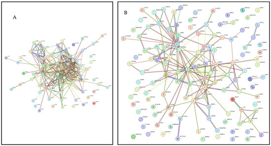 Figure 2. STRING protein–protein interaction (PPI) network. (A) PPI network for the upregulated miRNAS-predicted 74 genes (72 nodes and 281 edges, PPI enrichment p < 1.0 × 10−16). (B) PPI network for the downregulated miRNAS-predicted 123 genes (120 nodes and 189 edges, PPI enrichment p < 1.11 × 10−14).