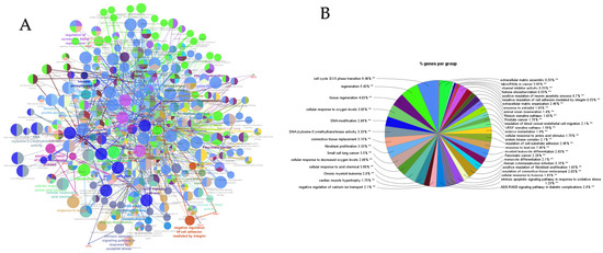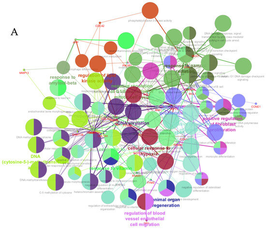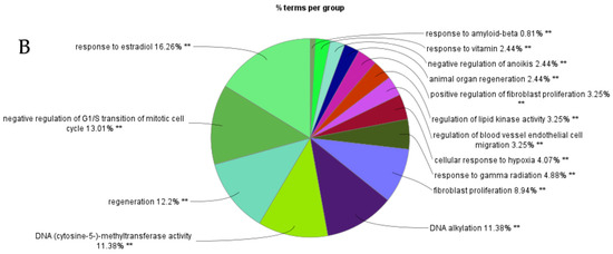Figure 2A presents PPI network for target genes of upregulated miRNAS (72 nodes; 281 edges; PPI enrichment p < 1.0 × 10−16) revealing 511 significantly (False Discovery Rate (FDR) p < 0.05) enriched GO biological processes and 77 significantly (FDR p < 0.05) enriched KEGG pathways (Supplementary File S3). Figure 2B shows PPI network for the downregulated miRNAs (120 nodes and 189 edges, PPI enrichment p < 1.11 × 10−14) with 299 significantly (FDR p < 0.05) enriched GO biological processes and 41 significant (FDR p < 0.05) KEGG pathways (Supplementary File S4).