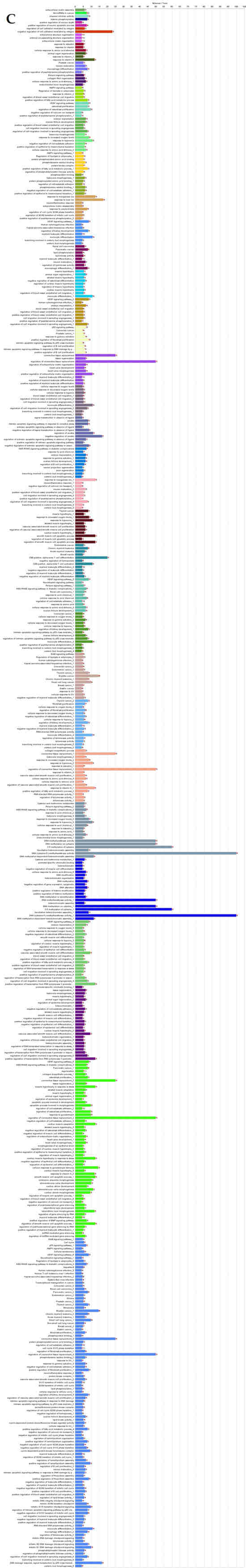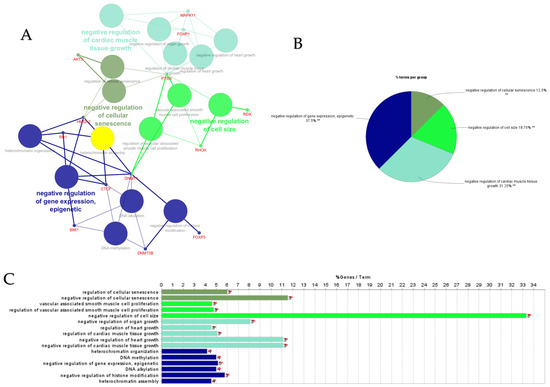 Figure 7. ClueGO analysis of downregulated hub genes in circulation in cows with metritis. (A) Functionally grouped network with terms as nodes linked based on their kappa score level (≥0.4), where only the label of the most significant term per group is shown. The node size represents the term enrichment significance. Functionally related groups partially overlap. The color gradient shows the gene proportion of each cluster associated with the term. (B) Overview chart with functional groups including specific terms for downregulated genes. The percentage of genes per term is shown as term label. ** p < 0.001. (C) GO/pathway terms specific for downregulated hub genes. The bars represent the number of genes associated with the terms. The number of genes per term is shown as bar label.