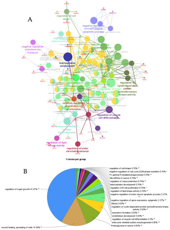 To explore the biological significance of DE-miRNAs and their associated genes, biological processes were analyzed using the PANTHER (Protein ANalysis THrough Evolutionary Relationships) Classification System (https://pantherdb.org accessed on 13 January 2025). Additional GO terms and their co-occurring terms were investigated using QuickGO (https://www.ebi.ac.uk/QuickGO accessed on 13 January 2025).