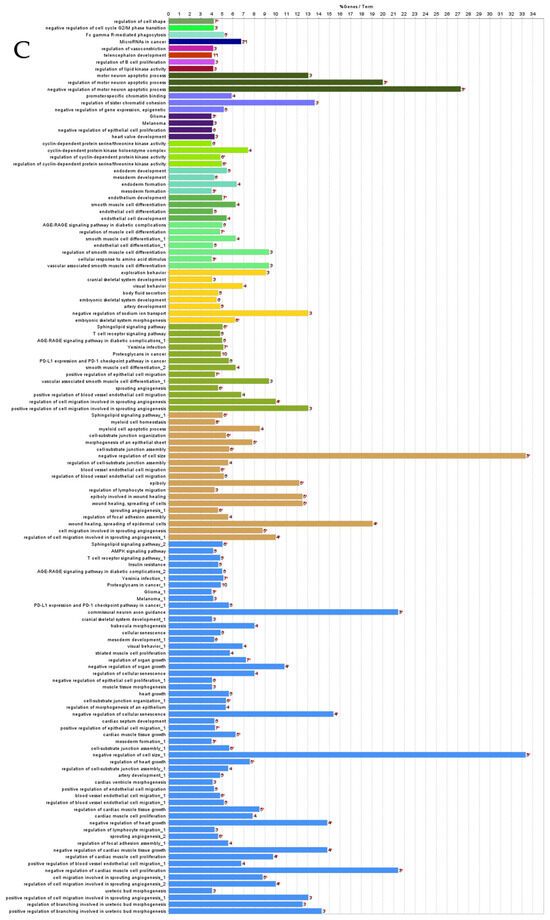 PPI networks were constructed using the STRING database and visualized in Cytoscape. To interpret the functionally nested ontology and pathway annotation networks for genes targeted by up- and downregulated DE-miRNAs in cows with metritis, ClueGO analyses were performed and visualized in Figure 3A–C and Figure 4A–C, respectively.