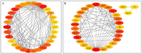 Figure 5. Protein–protein interaction (PPI) network of hub genes of DE-miRNAs. (A) PPI network of top genes for highly upregulated DE-miRNAs. (B) PPI network of the top genes for downregulated DE-miRNAs. DE-miRNAs differentially expressed microRNAs; black lines indicate interactions between genes. The PPIs among hub genes for upregulated DE-miRNAs were greater compared with hub genes for downregulated DE-miRNAs. A complete list of hub genes are provided in Table 1.