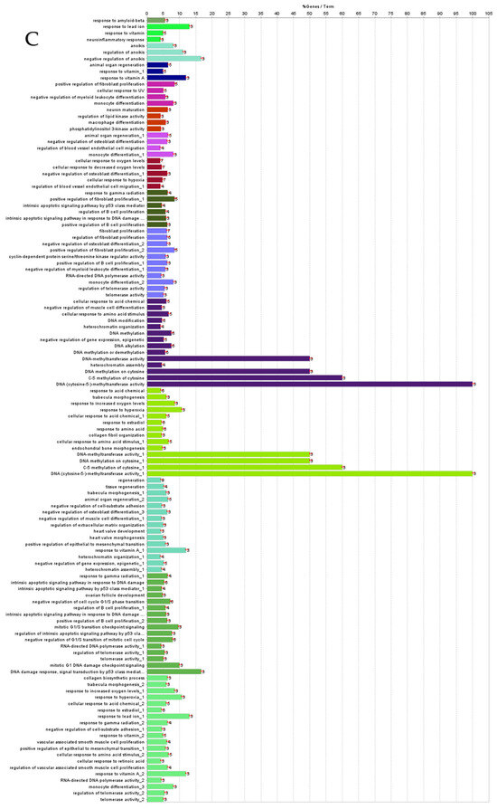 The target genes of DE-miRNAs were predicted using miRNet (http://www.mirnet.ca/ accessed on 10 January 2025) [21]. This tool integrated data from multiple miR databases including TarBase, miRTarBase, and miRecords. The target prediction analysis was performed separately for upregulated and downregulated DE-miRNAs.