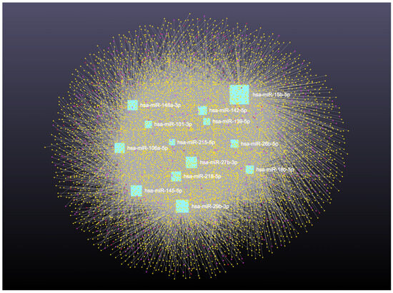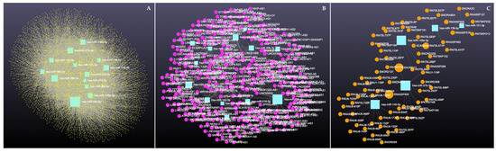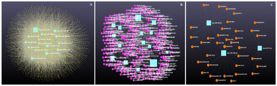 Similarly, analysis of the 14 downregulated miRNAs revealed interactions with 6313 unique circRNAs, 144 snRNAs, 337 lncRNAs, and 3401 genes (Supplementary File S6). The network is shown in Figure 10. In addition, miRNA to circRNA, miRNA to lncRNA, and miRNA to snRNA interactions are shown in Figure 11A, Figure 11B, and Figure 11C, respectively.