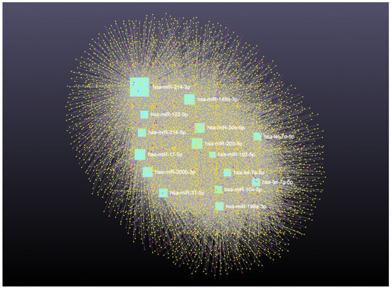 Interaction networks among miRNA, circRNA, lncRNA, snRNA, and mRNA were generated using miRNet (http://www.mirnet.ca/ accessed on 29 May 2025), separately for upregulated and downregulated miRNAs. Specific interaction maps, including miRNA–circRNA–mRNA, miRNA–lncRNA–mRNA, and miRNA–snRNA–mRNA networks, were also constructed.