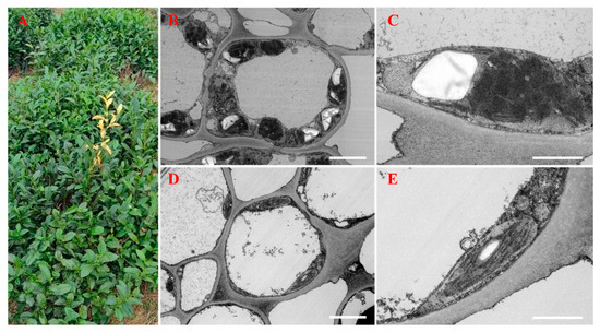 Phenotypes and ultrastructures of green and albino leaves. (A) Tea leaf phenotypes. An albino shoot is visible near the center of the image. (B) The ultrastructure of a third green leaf. (C) The chloroplast ultrastructure of a third green leaf. (D) The ultrastructure of a third albino leaf. (E) The chloroplast ultrastructure of a third albino leaf. The bars indicate 5 μm in (B,D) and 2 μm in (C,E).