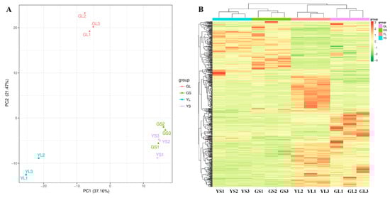 PCA (A) and clustering analysis (B) of differential metabolites in albino and normal leaves (GLs and YLs) and stems (GSs and YSs).