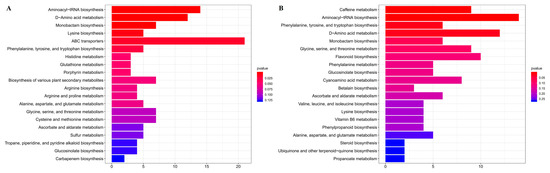 KEGG enrichment analyses of differentially abundant metabolites. (A) Normal leaves (GLs) versus albino leaves (YLs). (B) Albino leaves (YLs) versus albino stems (YSs). The top twenty enriched pathways for each comparison are shown.
